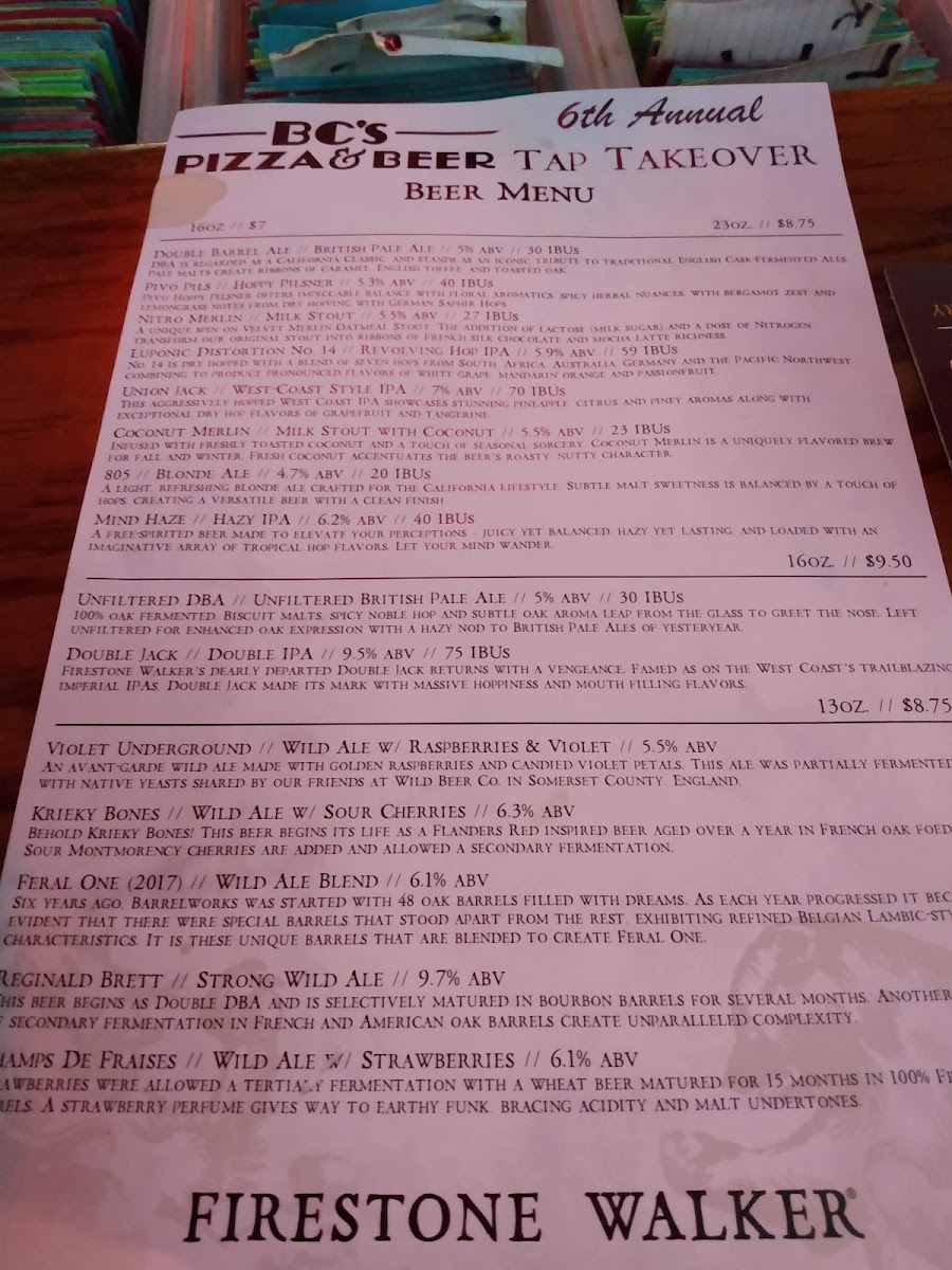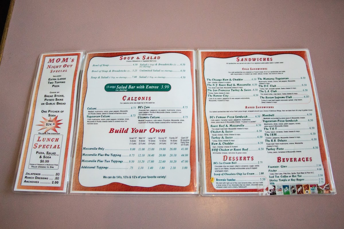 The menu features an array of mouthwatering appetizers, including super meaty wings and delightful cheese rolls. Don't miss the inviting salad bar and their famous cheesy garlic bread. For beer enthusiasts, BC's boasts an impressive selection of over 25 beers on tap, which rotate regularly, including local favorites like Firestone.